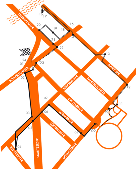 Spaziergang Dauer: 1h 40min Start- und Endpunkt: U-Bahnhof Schlesisches Tor, unten am Eingang Form: Alleingang Ausgestattet mit einem Audio-Player und Kopfhörern entdeckst du während eines Spaziergangs die Stadt neu. Du lernst drei unterschiedliche persönliche Blickwinkel kennen, die dich auf dem Weg durch die Kreuzberger Straßen leiten. Während du den persönlichen Orientierungspunkten und dem Rhythmus deiner Erzähler folgst, erlebst du, wie sich ihre Geschichten und deine eigene Wahrnehmung vom Alltag der Stadt verbinden. Die unterschiedlichen Wahrnehmungen legen sich übereinander und erzählen von der Vielschichtigkeit der Stadt. Räumen schafft Platz für die individuellen Geschichten der Stadt. |